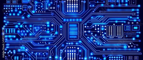 Poster a blue and white image of a network of lines and dots, blue technology background with circuit board