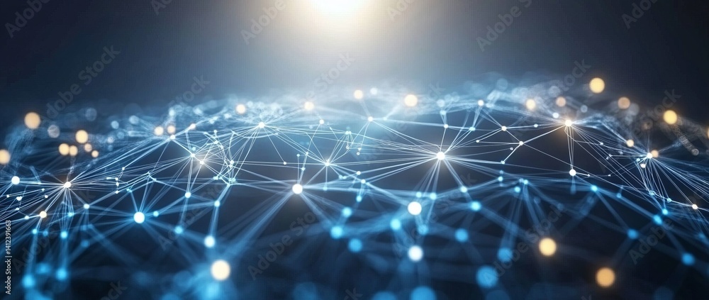Poster a blue and white image of a network of lines and dots, blue technology background with circuit board