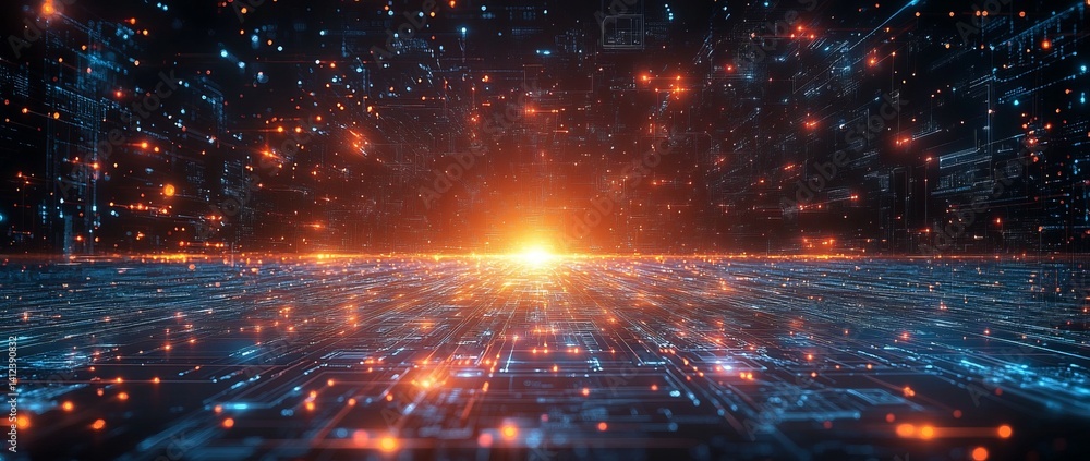 Poster : A blue and white image of a network of lines and dots, blue technology background with circuit board