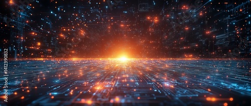 Poster a blue and white image of a network of lines and dots, blue technology background with circuit board