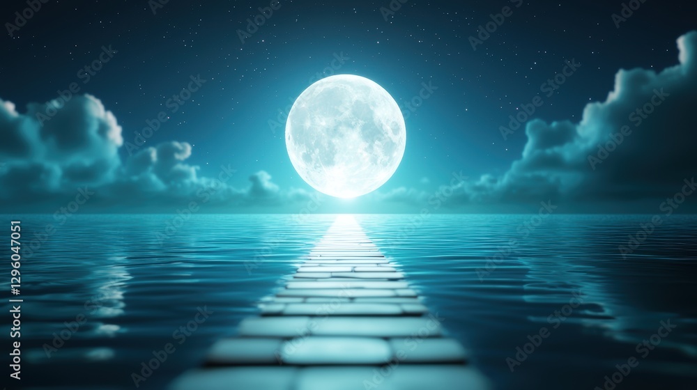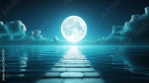 Poster a bright, full moon reflects brilliantly on the surface of a calm ocean, creating a shimmering path  - Posters Poster a bright, full moon reflects brilliantly on the surface of a calm ocean, creating a shimmering path - Posters