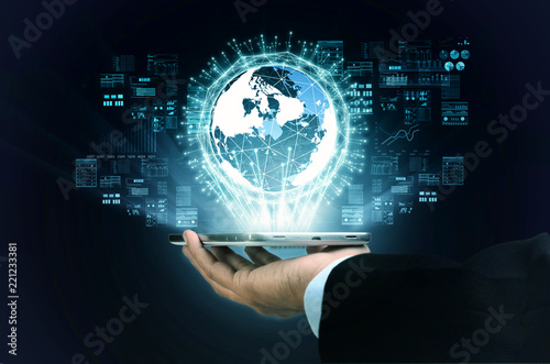The watermark will not be included on Poster.: A businessman showing internet big data computing process in his hand