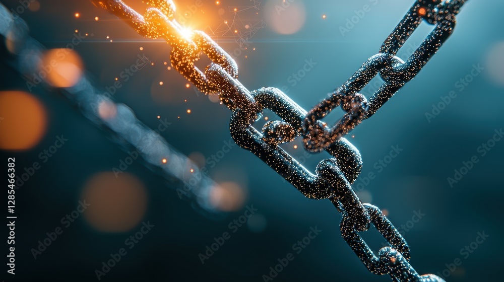 The watermark will not be included on Poster.: A chain of interconnected blocks with glowing lines and digital codes, representing the decentralize