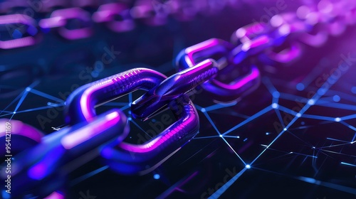 The watermark will not be included on Poster.: A close-up of a shiny, purple chain link on a dark background with a glowing abstract network -