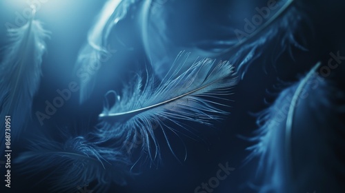 Poster a close-up view of feathers floating in air illuminated by soft blue light