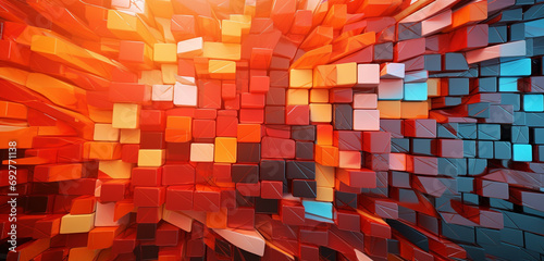 Poster : A complex 3d colorful mosaic arrangement with a symphony of colors and shapes on a backdrop of fiery