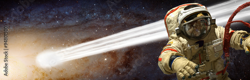 Poster a cosmonaut has a comet pass close to him - elements of this image furnished by nasa.