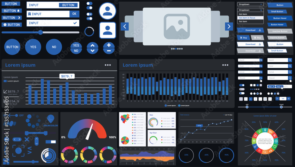 Poster a dark set of interface elements for web and mobile applications with modern icons, buttons, and gra - Posters Poster a dark set of interface elements for web and mobile applications with modern icons, buttons, and gra - Posters