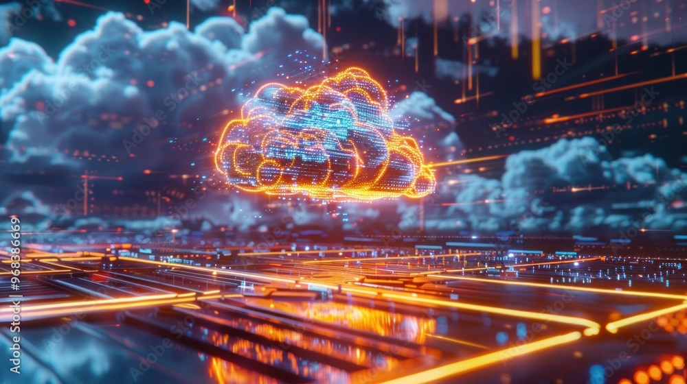 The watermark will not be included on Poster.: A digital cloud surrounded by glowing circuits and abstract data elements -