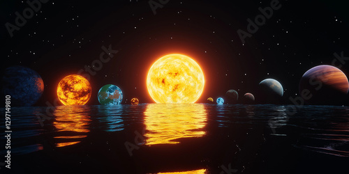 The watermark will not be included on Poster.: A dreamlike space landscape with planets floating above a reflective surface, creating a sense of tr