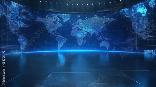 Poster : A futuristic, empty studio with a large digital map of the world on the curved wall, illuminated by
