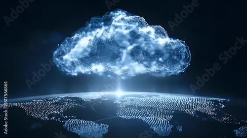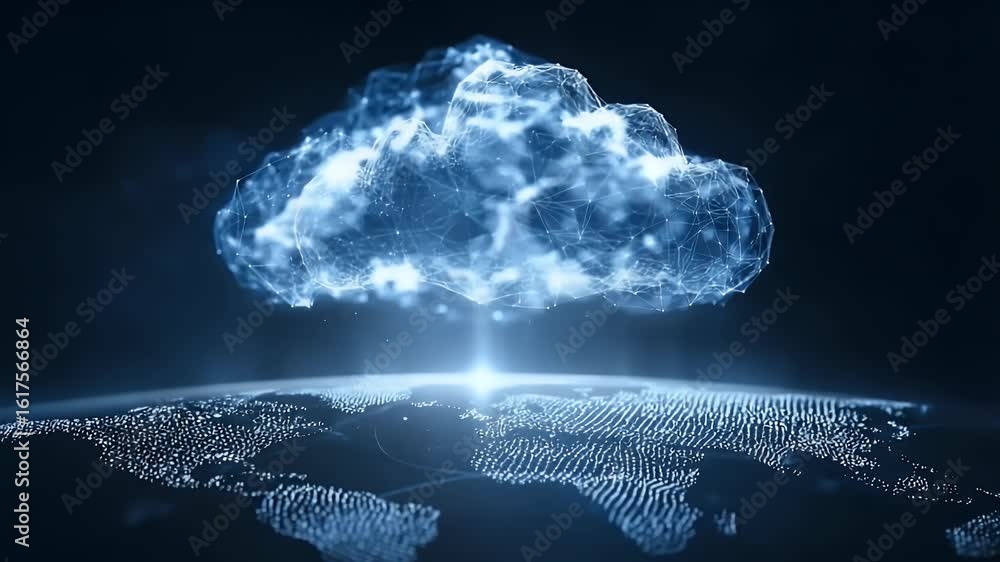 Poster : A glowing cloud symbolizing the global network of digital clouds, connected to various illustrated c