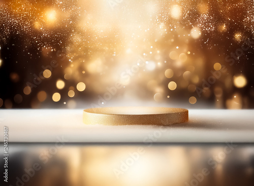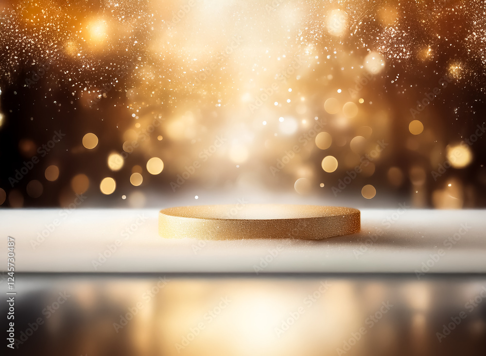 The watermark will not be included on Poster.: A golden podium is illuminated by a radiant, sparkling light against a dark backdrop with bokeh effe