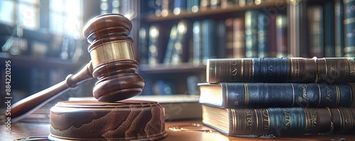 The watermark will not be included on Poster.: A hammer of justice and several books on a table with a bookshelf in the background and a spotlight