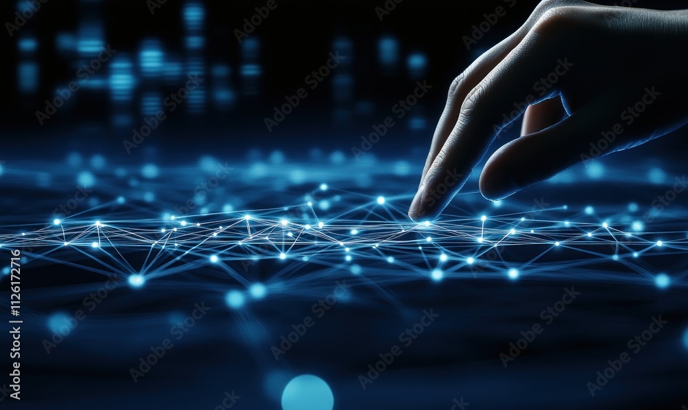 The watermark will not be included on Poster.: A hand interacts with a digital network of glowing nodes, symbolizing technology and connectivity -