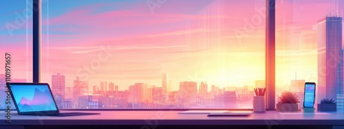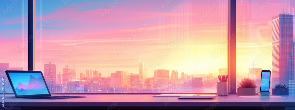 Poster a laptop and a cell phone are on a desk in front of a window - Posters Poster a laptop and a cell phone are on a desk in front of a window - Posters