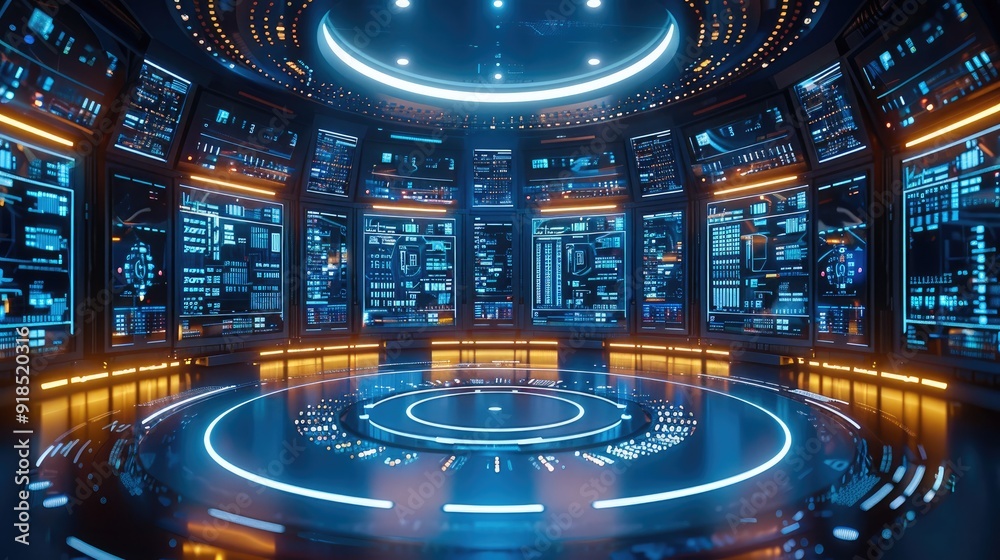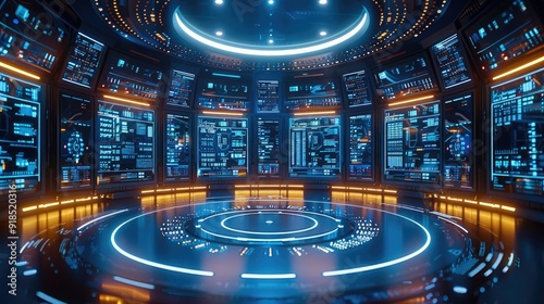 The watermark will not be included on Poster.: A large round room with an illuminated floor, futuristic digital blue background with glowing lines