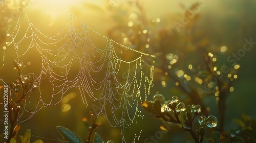 Poster : A macro photo of a spider web on a leaf with moisture droplets and the sun shining behind