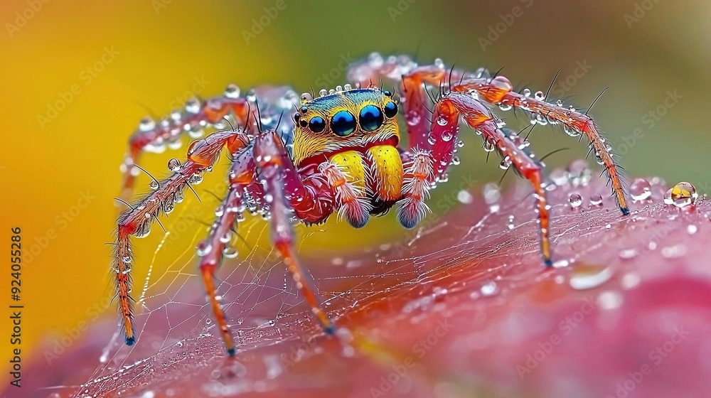 Poster a macro shot capturing a spider perched on a flower with dewdrops dripping from its legs - Posters Poster a macro shot capturing a spider perched on a flower with dewdrops dripping from its legs - Posters