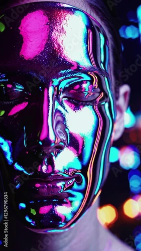 The watermark will not be included on Poster.: A mesmerizing display of a human face covered in reflective material, showcasing shifting colors and