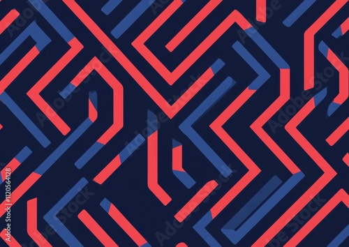 The watermark will not be included on Poster.: A modern, flat design pattern with blue and red lines forming an intricate maze on a navy background