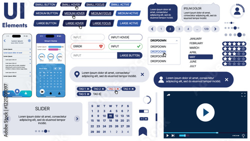 Poster a modern ui kit featuring a collection of buttons, icons, navigation menus, and responsive design el - Posters Poster a modern ui kit featuring a collection of buttons, icons, navigation menus, and responsive design el - Posters