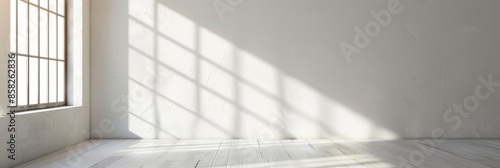 Poster a photograph of a white wall illuminated by soft sunlight streaming through a large window