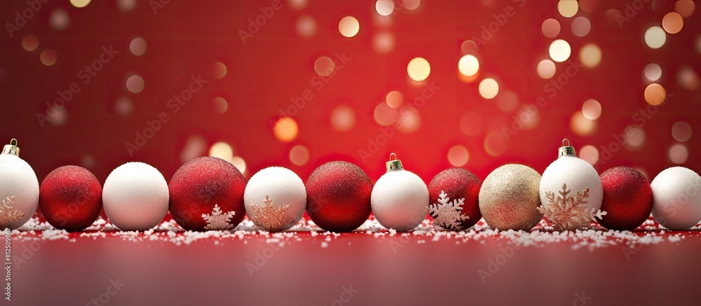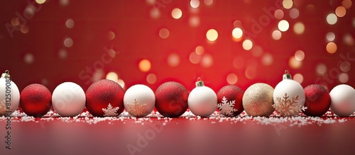 Poster a red textured background displays white and dark red christmas balls creating a visually appealing