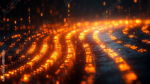 Poster a series of orange and black lines that look like a wave. digital data stream background with glowin