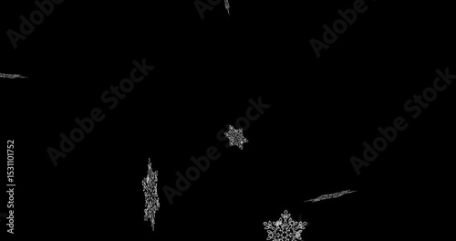 The watermark will not be included on Poster.: A single white snowflake explosion - flying snowflakes on a black background - abstract animation -