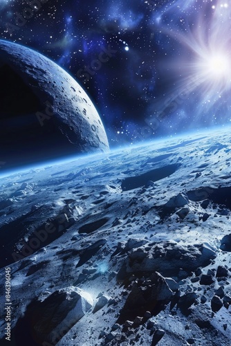 Poster a space scene with a large planet and a small moon