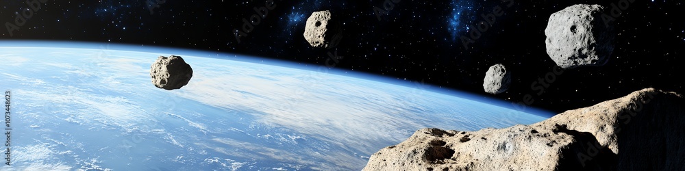 Poster a space scene with a planet and a bunch of rocks. the rocks are falling from the sky and the planet