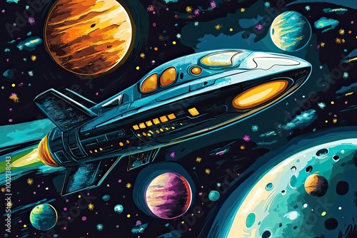 The watermark will not be included on Poster.: A spaceship flies through a field of stars and planets -