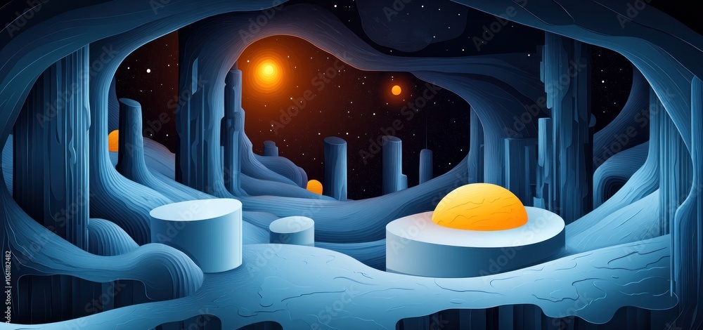 Poster : A surreal alien landscape with glowing orbs and abstract structures under a starry sky -
