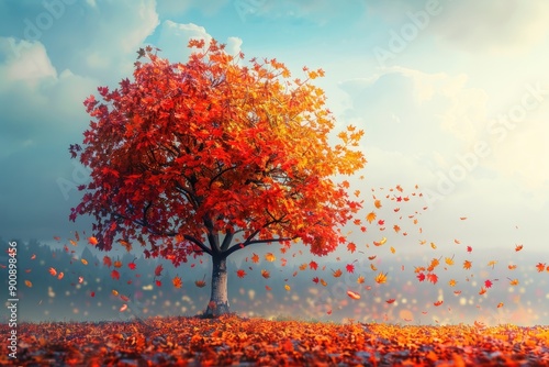 Poster a tree with red leaves is blowing in the wind. the leaves are scattered all around the tree, creatin