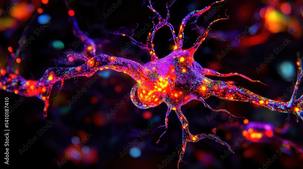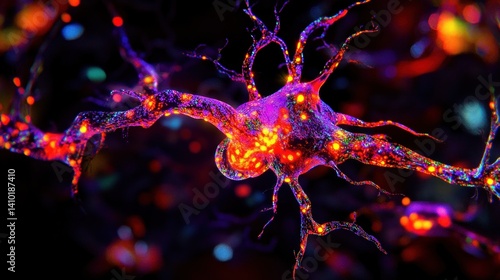 Poster a vibrant depiction of a neuron with intricate branches and glowing synapses, illustrating its vital - Posters Poster a vibrant depiction of a neuron with intricate branches and glowing synapses, illustrating its vital - Posters