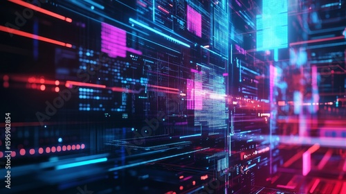 The watermark will not be included on Poster.: A vibrant digital landscape showcases technology in motion - the colorful lines symbolize data flow a