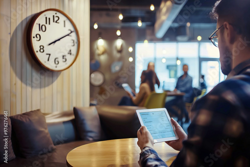 A young professional using a tablet with a project management app, seated in a co-working space withPoster