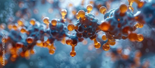 Poster abstract 3d rendering of a molecule with blue and orange spheres.