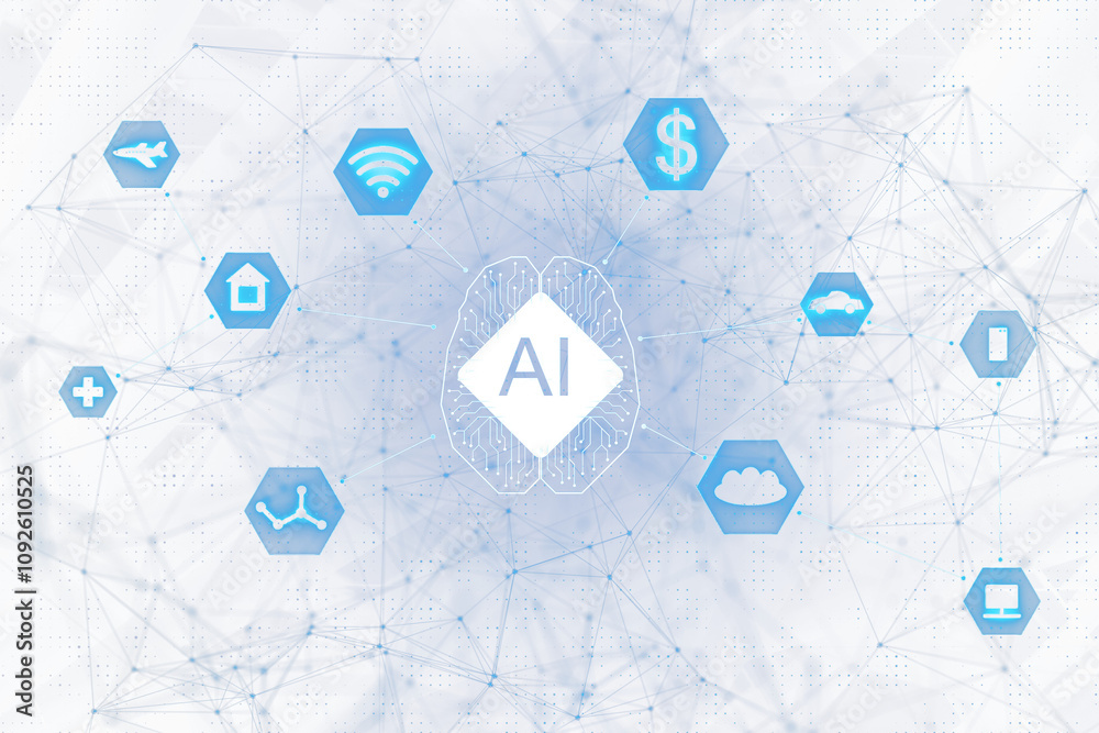 Poster : Abstract ai brain icon surrounded by hexagonal network icons and connections - minimalist white backg