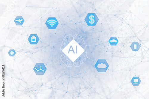 The watermark will not be included on Poster.: Abstract ai brain icon surrounded by hexagonal network icons and connections - minimalist white backg