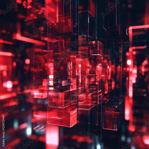 The watermark will not be included on Poster.: Abstract background with red and black cubes and holographic shapes in a futuristic design