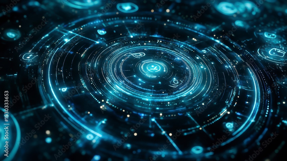 The watermark will not be included on Poster.: Abstract blue digital hud interface with glowing concentric circles and icons -