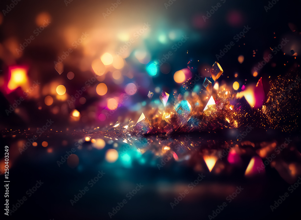 The watermark will not be included on Poster.: Abstract blurry background with colorful bokeh lights and geometric shapes creates a festive and mag