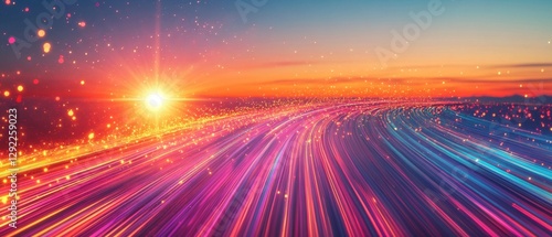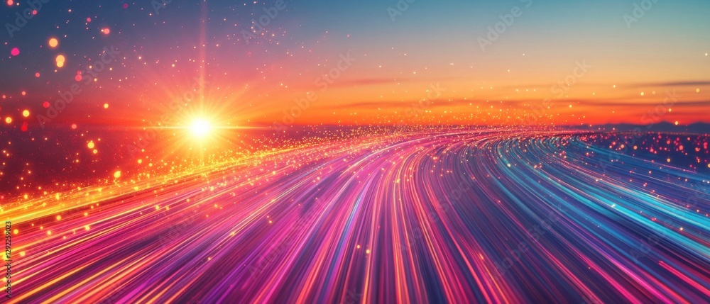 Abstract colorful light trails with glowing particles at sunset, representing high speed data transfPoster