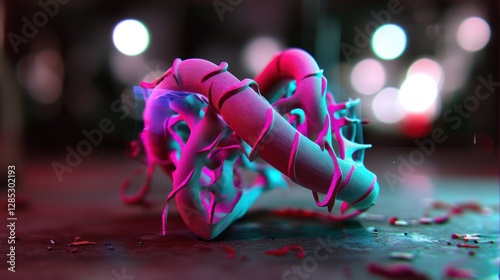 Poster abstract colorful sculpture intertwined with dynamic shapes on a blurred urban background