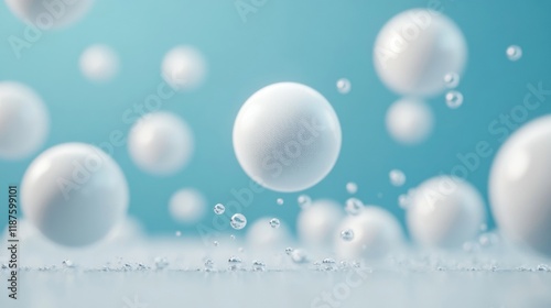 The watermark will not be included on Poster.: Abstract composition of floating white spheres enhances a calming environment with an airy light blu