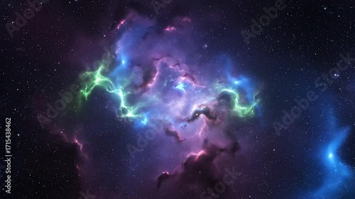 The watermark will not be included on Poster.: Abstract deep cosmic nebula with slowly pulsating green and blue bioluminescent patterns, a seamless