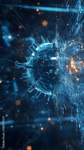 The watermark will not be included on Poster.: Abstract digital virus with glowing blue wireframe and data particles