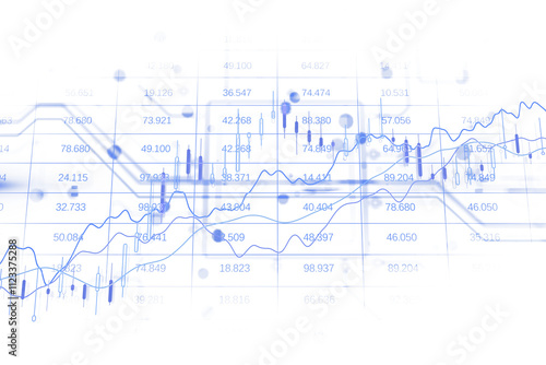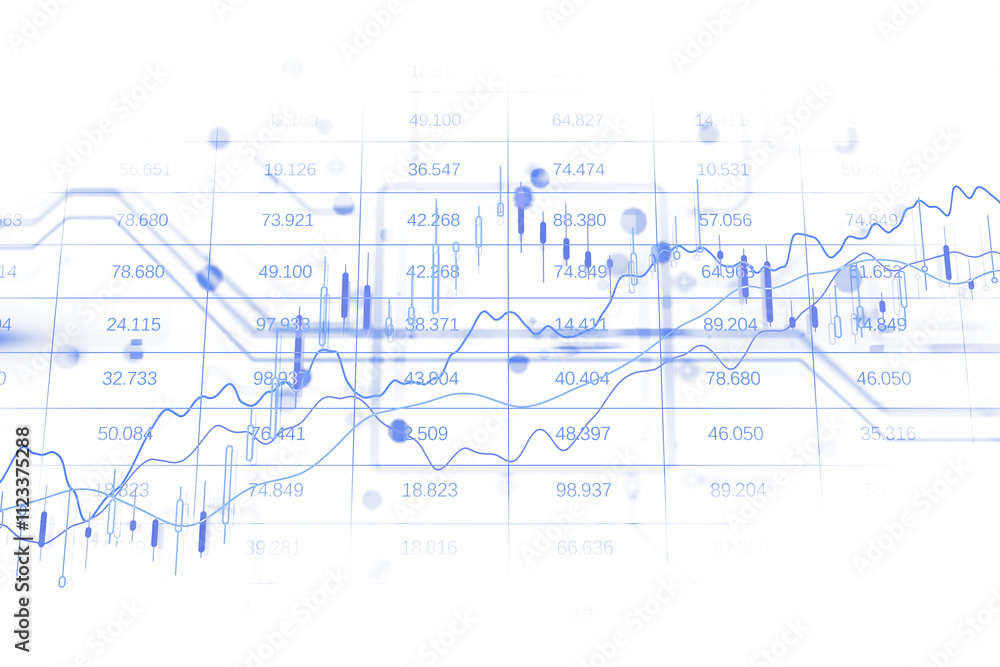 Poster abstract financial chart with blue candlesticks, lines, and numbers overlaying a grid pattern on a w
